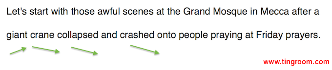 模仿句子:Let's start with those awful scenes at the Grand Mosque1 in Mecca after a giant crane collapsed2 and crashed onto people praying at Friday prayers.