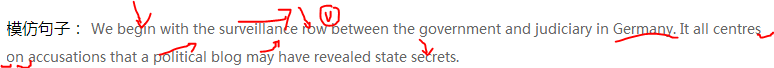 【模仿句子】 We begin with the surveillance row between the government and judiciary in Germany. It all centres on accusations1 that a political blog may have revealed state secrets.