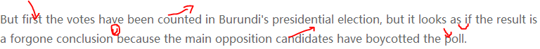 But first the votes have been counted in Burundi's presidential election, but it looks as if the result is a forgone1 conclusion because the main opposition2 candidates have boycotted3 the poll.
