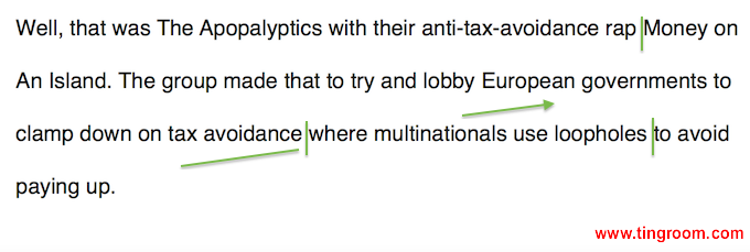 模仿句子:Well, that was The Apopalyptics with their anti-tax-avoidance rap Money on An Island. The group made that to try and lobby European governments to clamp down on tax avoidance where multinationals1 use loopholes to avoid paying up.