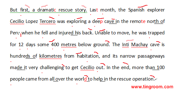 模仿文本:But first, a dramatic1 rescue story. Last month, the Spanish explorer Cecilio Lopez Tercero was exploring a deep cave in the remote north of Peru when he fell and injured his back. Unable to move, he was trapped for 12 days some 400 metres below ground. The Inti Machay cave is hundreds of kilometres from habitation, and its narrow passageways made it very challenging to get Cecilio out. In the end, more than 100 people came from all over the world to help in the rescue operation.
