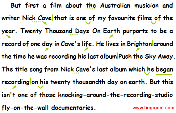 模仿文本:But first a film about the Australian musician and writer Nick Cave that is one of my favourite films of the year. 20,000 Days On Earth purports1 to be a record of one day in Cave's life. He lives in Brighton around the time he was recording2 his last album Push the Sky Away. The title song from Nick Cave's last album which he began recording on his 20,000th day on earth. But this isn't one of those knocking-around-the-recording-studio fly-on-the-wall documentaries.