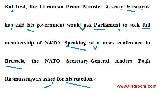 译文: 首先,乌克兰总理阿尔谢尼·亚采纽克表示,乌克兰政府将提请国会为乌克兰争取北大西洋公约组织(以下简称NATO)正式会员资格。正在布鲁塞尔的新闻发布会上发言的NATO秘书长安德斯·福格·拉斯穆森也被问及对此事的回应.