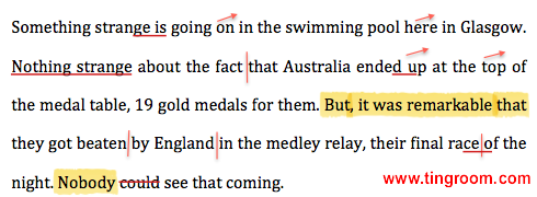 模仿文本: Something strange is going on in the swimming pool here in Glasgow. Nothing strange about the fact that Australia ended up at the top of the medal table, 19 gold medals for them. But, it was remarkable1 that they got beaten by England in the medley2 relay, their final race of the night. Nobody could see that coming.