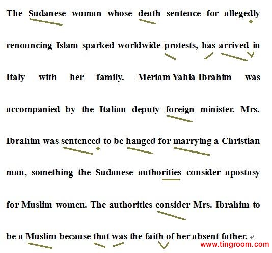 The Sudanese woman whose death sentence for allegedly renouncing1 Islam sparked worldwide protests, has arrived in Italy with her family. Meriam Yahia Ibrahim was accompanied by the Italian deputy foreign minister. Mrs Ibrahim was sentenced to be hanged for marrying a Christian2 man, something the Sudanese authorities consider apostasy3 for Muslim women. The authorities consider Mrs Ibrahim to be a Muslim because that was the faith of her absent father.