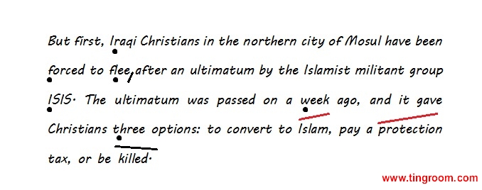 But first, Iraqi Christians1 in the northern city of Mosul have been forced to flee after an ultimatum2 by the Islamist militant3 group ISIS. The ultimatum was passed on a week ago, and it gave Christians three options: to convert to Islam, pay a protection tax, or be killed.