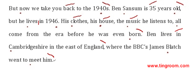 译文:现在我们带您重返20世纪40年代。现年35岁的本•山萨姆,却生活在1946年。他的衣服、房子,还有他听的音乐,全部都来自他出生前的时代。他现居英国东部的剑桥郡,BBC的詹姆斯•布拉奇前去拜访了他。