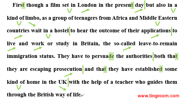模仿文本:First though a film set in London in the present day but also in a kind of limbo1, as a group of teenagers from African and Middle Eastern countries wait in a hostel2 to hear the outcome of their applications to live and work or study in Britain, the so-called leave-to-remain immigration status. They have to persuade the authorities both that they are escaping persecution3 and that they have established some kind of home in the UK with the help of a teacher who guides them through the British way of life.