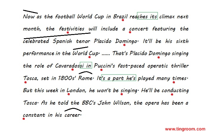 Now as the football World Cup in Brazil reaches its climax1 next month, the festivities will include a concert featuring the celebrated2 Spanish tenor3 Placido Domingo. It'll be his sixth performance in the World Cup. ……That's Placido Domingo singing the role of Cavaradossi in Puccini's fast-paced operatic thriller4 Tosca, set in 1800s' Rome. It's a part he's played many times. But this week in London, he won't be singing. He'll be conducting Tosca. As he told the BBC's John Wilson, the opera has been a constant in his career.