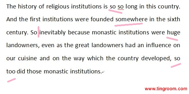 模仿文本: The history of religious institutions is so so long in this country. And the first institutions were founded somewhere in the sixth century. So inevitably1 because monastic institutions were huge landowners, even as the great landowners had an influence on our cuisine2 and on the way which the country developed, so too did those monastic institutions.
