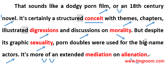 模仿文本:That sounds like a dodgy porn film, or an 18th century novel, it's certainly a structured conceit1 with themes, chapters, illustrated2 digressions and discussions on morality. But despite its graphic3 sexuality, porn doubles were used for the big-name actors, it's more of an extended meditation4 on alienation5. (注意标红处的勘误)