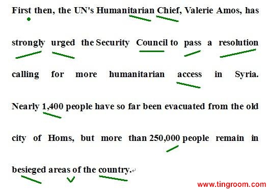 First then, the UN's Humanitarian1 Chief, Valerie Amos, has strongly urged the Security Council to pass a resolution calling for more humanitarian access in Syria. Nearly 1,400 people have so far been evacuated2 from the old city of Homs,but more than 250,000 people remain in besieged3 areas of the country.