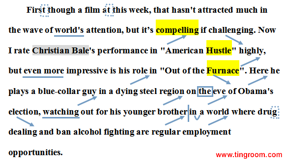 模仿文本:First though a film at this week, that hasn't attracted much in the wave of world's attention, but it's compelling if challenging. Now I rate Christian1 Bale's performance in "American Hustle2" highly but even more impressive is his role in "Out of the Furnace". Here he plays a blue-collar guy in a dying steel region on the eve of Obama's election, watching out for his younger brother in a world where drug dealing3 and bare-knuckle fighting are regular employment opportunities.(标红处有勘误~)