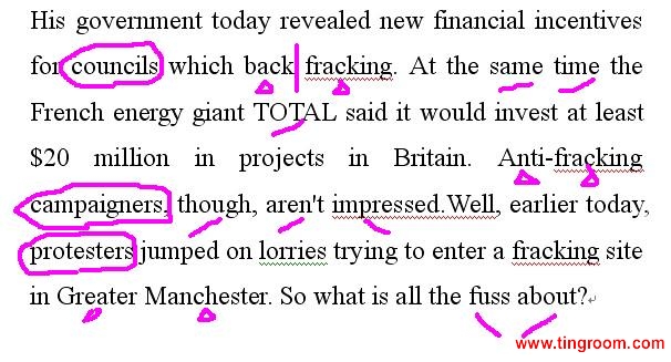 译文:卡梅隆政府今天公布了针对支持液压破碎的委员会的新财政刺激计划。同时,法国能源巨头道达尓表示要在英国项目上投资至少2千万美元。但反对液压破碎的活动人士并不以为意。今天早些时候,抗议者跳上卡车,试图进入大曼彻斯特地区的液压破碎现场。这到底都是在闹些什么?