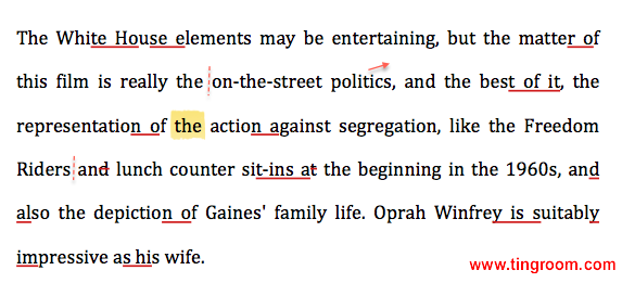 译文:在电影里加入白宫元素可能会使其具有娱乐性,但《白宫管家》这部电影中的白宫却并非如此。最棒的一点在于,它呈现了反种族隔离运动,如1960年代初的自由乘车客和(格林斯博罗)便餐馆静坐。它还描述了艾伦的家庭生活。奥普拉·温弗瑞在片中饰演他的妻子,其惟妙惟肖的表演让人印象深刻。