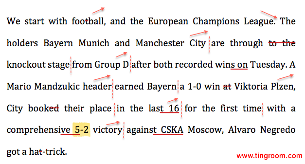 译文:先来看足球。本周二,欧冠联赛卫冕冠军拜仁慕尼黑(Bayern Munich)和曼城(Manchester City)双双获胜,率先D组出线进入欧冠淘汰赛。拜仁的马里奥•曼祖基奇(Mario Mandzukic)头球破门,1-0小胜比尔森胜利(Viktoria Plzen)。曼城则以5-2大胜莫斯科中央陆军(CSKA Moscow),提前出线并首进16强。阿尔瓦罗•内格雷多(Alvaro Negredo)上演了帽子戏法。
