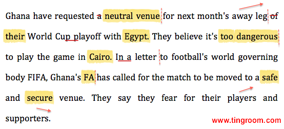 译文:下月世界杯季后赛加纳(Ghana)客场对战埃及,加纳请求比赛于中立场进行。他们认为在开罗(Cairo)比赛实在太危险。加纳足球协会给国际足球联盟(FIFA)写信,请求将比赛移至安全场地。加纳表示对其球员和支持者很担心。