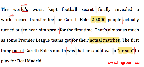译文:这是世界上保密措施做得最失败的足球秘闻:贝尔的转会费打破了世界纪录。2万人来到现场听他本人就此事件发表的第一次声明。该人数几乎和有些英超球队实际比赛的观众数一样多。贝尔一开口就表示,为皇马效力是他的“梦想”。