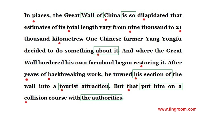 In places, the Great Wall of China is so dilapidated that estimates of its total length vary from nine thousand to 21 thousand kilometres. One Chinese farmer Yang Yongfu decided1 to do something about it. And where the Great Wall bordered his own farmland began restoring it. After years of backbreaking work, he turned his section of the wall into a tourist attraction. But that put him on a collision course with the authorities.