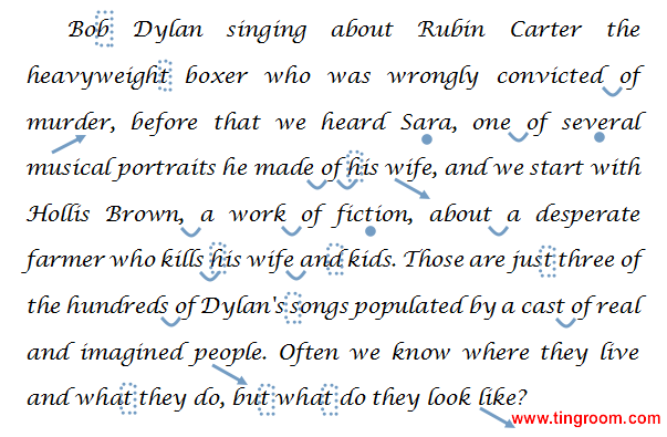 模仿文本:Bob Dylan singing about Rubin Carter the heavyweight boxer1 who was wrongly convicted2 of murder, before that we heard Sara, one of several musical portraits he made of his wife, and we start with Hollis Brown, a work of fiction, about a desperate farmer who kills his wife and kids. Those are just three of the hundreds of Dylan's songs populated by a cast of real and imagined people. Often we know where they live and what they do, but what do they look like?