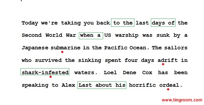 Today we're taking you back to the last days of the Second World War when a US warship1 was sunk by a Japanese submarine in the Pacific Ocean. The sailors who survived the sinking spent four days adrift in shark-infested waters. Loel Dene Cox has been speaking to Alex Last about his horrific ordeal2.