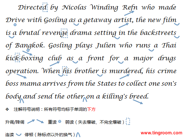 Directed by Nicolas Winding1 Refn who made Drive with Gosling as a getaway artist, the new film is a brutal2 revenge drama setting in the backstreets of Bangkok. Gosling plays Julien who runs a Thai kick-boxing club as a front for a major drugs operation. When his brother is murdered, his crime boss mama arrives from the States to collect one son's body and send the other on a killing's breed.