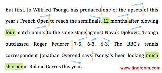 首先,特松加(Jo-Wilfried Tsonga)晋级法网半决赛,(费德勒败北)给今年的法网公开赛带来了一大沮丧。一年前特松加对战德约科维奇(Novak Djokovic)曾丢掉四个赛点,而本场比赛特松加7-5,6-3,6-3大胜费德勒(Roger Federer)。BBC记者乔纳森·欧沃尼(Jonathan Overend)认为特松加今年在罗兰·加洛斯(Roland Garros)球场打起比赛更为凶猛了。