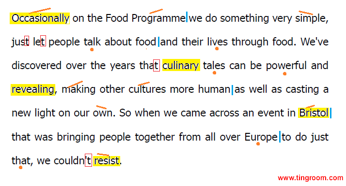 译文: 我们偶尔会在美食节目中偷点懒,单纯让大家谈谈美食和他们的美食生活。多年来我们发现,关于美食的故事既励志又益智,既拉近了我们与其他文化的距离,又让我们对自己的文化有一个新的认识。所以一听说布里斯托有这么个全欧洲吃货交流的活动,我们就忍不住来了。