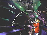 | Visitors observe sea creatures in their natural habitat from a glass tunnel at Underwater World |