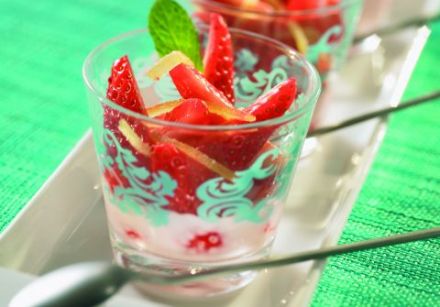 Pour the coconut cream into dessert cups; add the strawberries and the mint. Serve immediately.