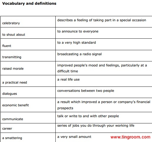 BBC Learning English 6 Minute English 12 September 2013 70 Years of Learning ![]() 图片1 Rob: Hello, I'm Rob and this is 6 Minute English and I'm joined this week by Finn. Hello Finn. Finn: Hello Rob. Rob: We are in a celebratory mood this week Finn aren't we? Finn: Yes we are. We have something to shout about – it's the 70th anniversary of the BBC teaching English to the world. Rob: Happy birthday to us! So, we have been teaching English for 70 years – actually Finn I think we look quite good for 70! Finn: Yes, not too many grey hairs. And you would think that if our audience has been listening for 70 years they would be fluent – or perfect speakers of English by now. Maybe we should just go home now? Rob: Stay where you are – of course you know Finn that our audience is always changing. New people are finding us and wanting to learn English and we'll be finding out why they do very soon. But let's see what you've learnt over the years and see if you can answer this question. According to the Oxford English Dictionary, what is the most commonly used English word. Is it: a) I b) and c) the Finn: Rob, I think it has to be c) the. Rob: I'll let you know the answer at the end of the programme. Now let's talk more about 70 years of teaching English. The BBC's English-teaching department first started transmitting radio programmes in 1943. The world was a very different place then. Finn: Yes. World War Two was taking place and many parts of Europe were occupied by German forces. It was felt that by teaching other nationalities English, they could understand radio news bulletins on the BBC Empire Service – the old name for the BBC World Service. Rob: So, for many listeners there was a practical need to learn English. Finn: After the war there was a big demand in people wanting to learn English and the BBC tried to do this in "…light and entertaining dialogues in simple, though not basic,English." That's conversations that sounded natural and interesting to listen to. Rob: A bit like our programmes today. In the years after the war, people wanted to learn English not just to understand programmes on the BBC but so they could do business with or work for companies around the world. So we could say it had an economic benefit. Finn: Today, people are learning online via the internet and some are learning English to communicate with – or talk or write to – other non-native speakers, particularly on social media. Rob: That's true. We can hear from some students now who are learning English here in the UK. See if you can hear why they think it's important to learn English: Vox pop of students: My name is Bruno, I am from France, I like to learn English because this language is international and I can use it to have a conversation with people from different countries. I have more liberty if I want to speak with different people. My name is Juan Reynoso, I come from Peru. I want to learn English because I think this is the language the world speaks. Rob: Some good reasons there. Bruno and Juan want to learn English to communicate with others. Bruno says it gives him more liberty – he means freedom to speak with and understand other people. Finn: So, English is good for that but let's hear some more practical reasons – or ways that it will be a real benefit to someone's life: Vox pop of students: My name is Rafael Guimaraes, I come from Sao Paulo in Brazil. I've chosen English because I am studying business so it's very important for my career and also because you can communicate to people from all over the world. My name is Ivo. I am from Lima, Peru. I am planning on studying mechanical engineering and there is not much market for it in Peru, so I'm thinking of going abroad and for that I will need to learn another language so that's why I'm learning English too. Rob: So, Rafael and Ivo are learning English to help with their studies. They hope it will help their career. Finn: The jobs they will end up doing. So really they are learning English to help themselves! Rob: Well luckily, BBC Learning English is here to help those and many other students around the world learn English. It is one of the world's most widely spoken languages so it is good to have a least a smattering – a small understanding – of English. Finn: Yes, and if you want to live in the UK it's now expected that you can speak at least some English. But come on Rob, let's face it, learning a new language is fun too. Rob: That's true and it's been fun teaching it for 70 years – let's hope we've helped at least some of you learn the language. Now Finn, let's find out if you answered my question correctly. Earlier I asked you what is the most commonly used English word. Finn: I said the. Rob: And you are right. The is the most commonly used word. Well, that's all we have time for today. Please join us again soon and keep learning English with BBC learningEnglish. Both: Bye.