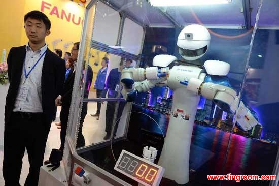 | A visitor tries to operate a robot during the 15th China International Industry Fair in Shanghai, east China, Nov. 5, 2013. (Xinhua/Liu Xiaojing) |