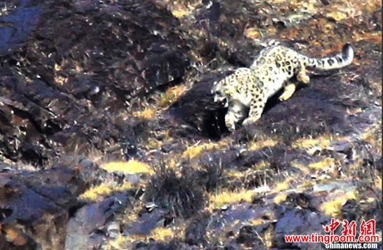 | A wild snow leopard was captured on camera chasing a flock of capra ibexes in China's Xinjiang on Nov. 3. |