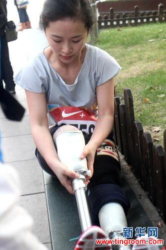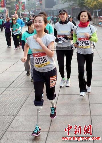| A double amputee, Liao Zhi ran with a big smile on her face and her two prosthetic legs carrying her. |