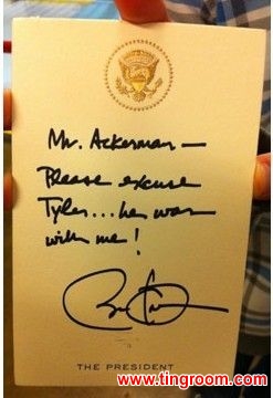 ‘Mr. Ackerson, Please Excuse Tyler... he was with me! Barack Obama,’ the President wrote。