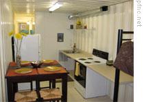 The sample home is twelve meters long and about two and a half meters in width and height. The kitchen has a stove to cook meals and a refrigerator to keep foods cold. Children and adults have separate sleeping areas.