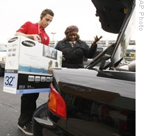 | An employee loads a TV for a shopper at Circuit City, a major seller of electronics. It sought bankruptcy1 protection last month and is closing one-fifth of its stores to reorganize. |