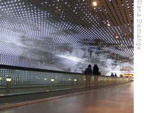 Visiting the tunnel is like entering a magical and mysterious world. The lights surrounding you turn on and off in a complex series of patterns. Sometimes all the lights seem to be on. Then they fade into a new formation3. The lights look like dancing stars in a night sky. Or they look like expanding moons. Or like cell organisms4 dividing into new forms. Visitors walk through the tunnel, or they stand on a moving electric walkway to enjoy the light display. It is also fun to watch other people's reactions to the art. Some people smile with praise. Others stop in their path out of total wonder.