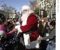 | Greg Kaland, a professional Santa Claus, with children at a Christmas toy party on Sunday in Los Angeles' Skid4 Row area |