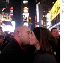 | T.J. MacDonald, left, and Stacey Fox, both of Syracuse, New York, welcoming 2008 in Times Square in New York City |