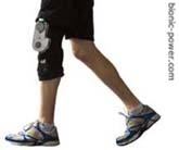 The device connects to a person's knee. As the person walks, the device captures energy each time the person slows down. To do this, the device assists with the slowing down movement of the leg. The movements of the person walking push parts of a small machine that produces electricity.