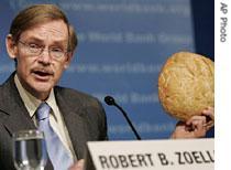 | World Bank President Robert Zoellick holds up bread as he speaks to reporters |