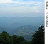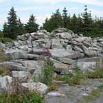 Whispering Spruce Trail follows a circular path around the observation tower. The path leads past an open field covered with huge rocks, through a group of tall spruce trees, and past a field of blueberry bushes. Off in the distance you see a valley way below and lines of bluish gray mountains that seem to reach forever.