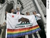 | Same-sex partners Stuart Gaffney, left, and John Lewis, second from left, celebrate the California Supreme3 Court's decision in their case in front of San Francisco's court house |