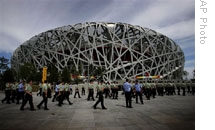 | Security forces patrol Beijing's National Stadium, site of the opening ceremonies |
