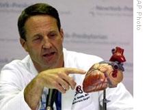 | Doctor Craig Smith uses a model to explain the heart operation he performed on former president Bill Clinton in September 2004 |