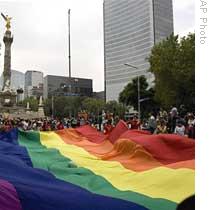 | People carry a gay pride flag during a march in Mexico City on August 2, 2008 |