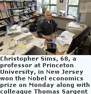 Christopher Sims, 68, a professor at Princeton University, in New Jersey4 won the Nobel economics prize on Monday along with colleague Thomas Sargent