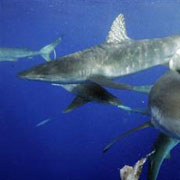 | Sharks swimming in the Pacific Ocean about five kilometers from the coast of Hawaii |