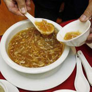 | A bowl of shark fin soup being served at a Chinese restaurant in the Chinatown neighborhood of San Francisco, California |